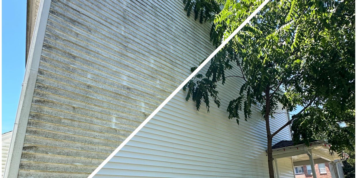- Most surfaces are cleaned using low pressure (soft washing) — not blasting with high PSI. This allows us to safely clean siding, soffits, gutters, windows, and trim with minimal risk of damage.